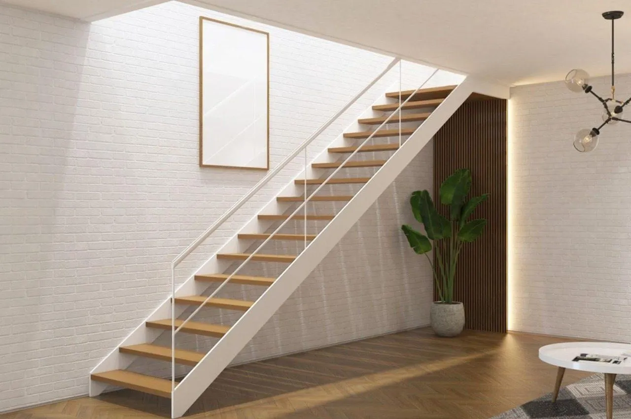 2. Прямая лестница на косоурах: Дополненная деревянной отделкой, эта лестница получает завершенность и благородство. Прочная основа на косоуре, обшитая деревом, создает воздушный и легкий внешний вид, оставляя ощущение как изысканности, так и надежности.