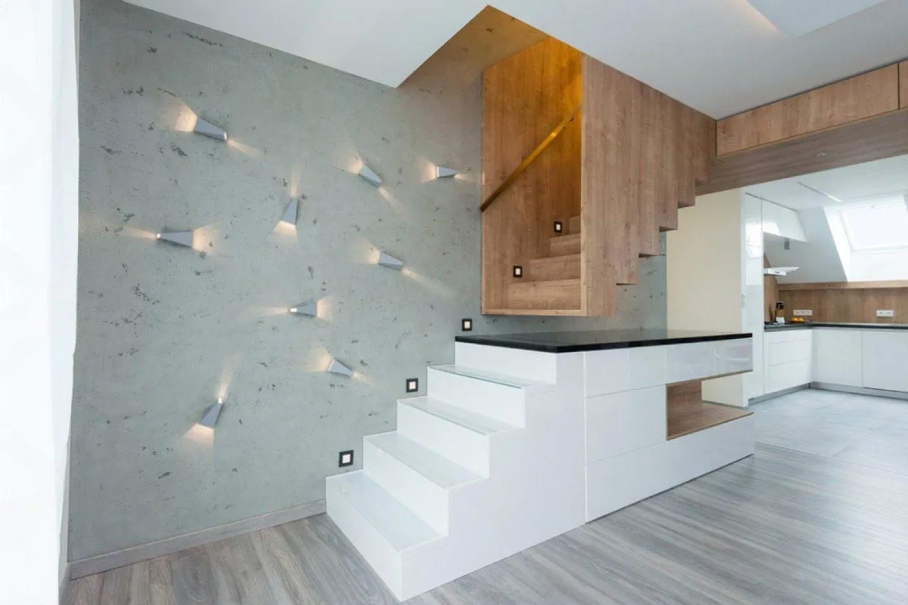 1. Прямая бетонная лестница: Холодный бетон может выглядеть совершенно иначе после облицовки деревом. Обшивка прямой бетонной лестницы делает конструкцию теплой и безопасной, превращая практичные элементы в эстетически привлекательные части вашего дома.